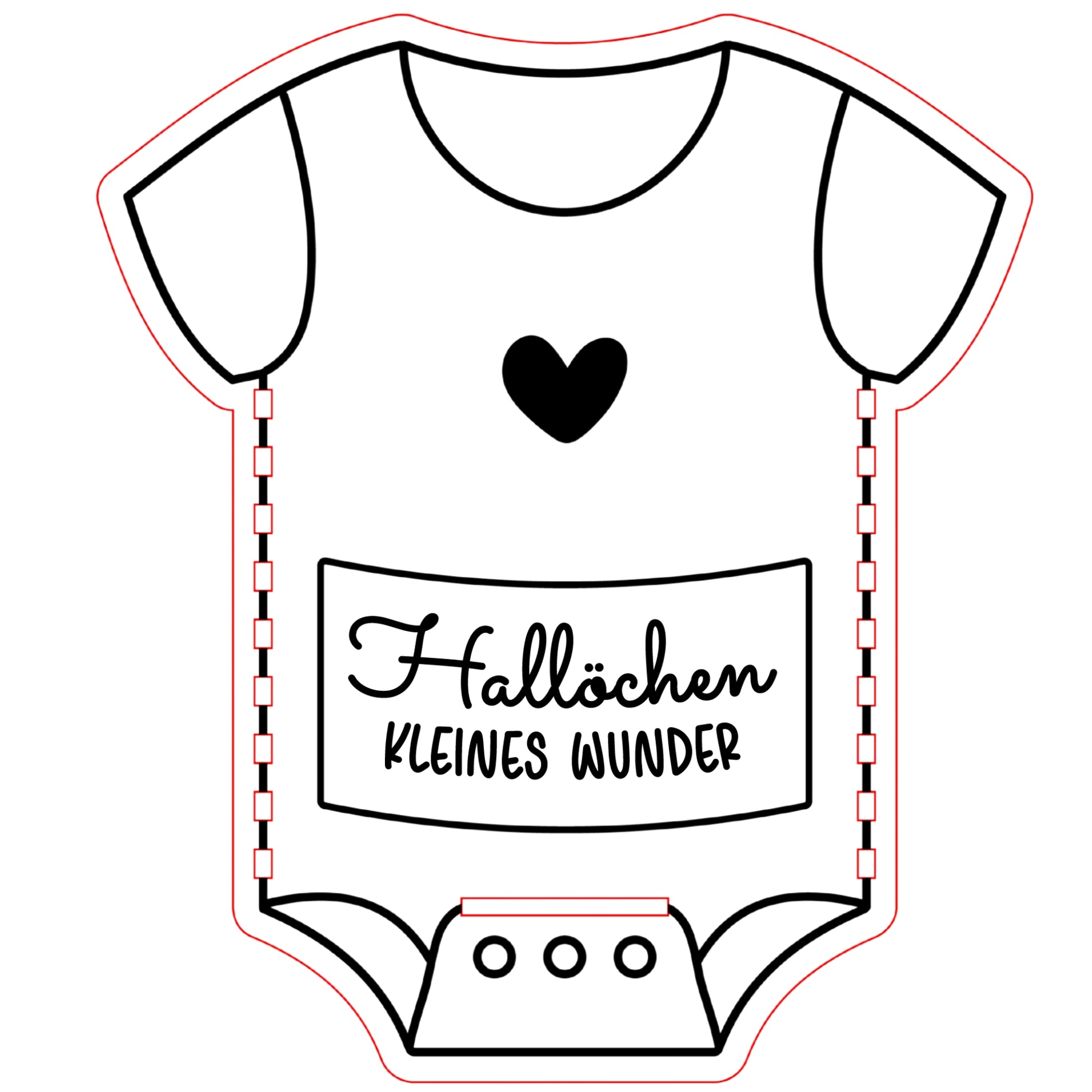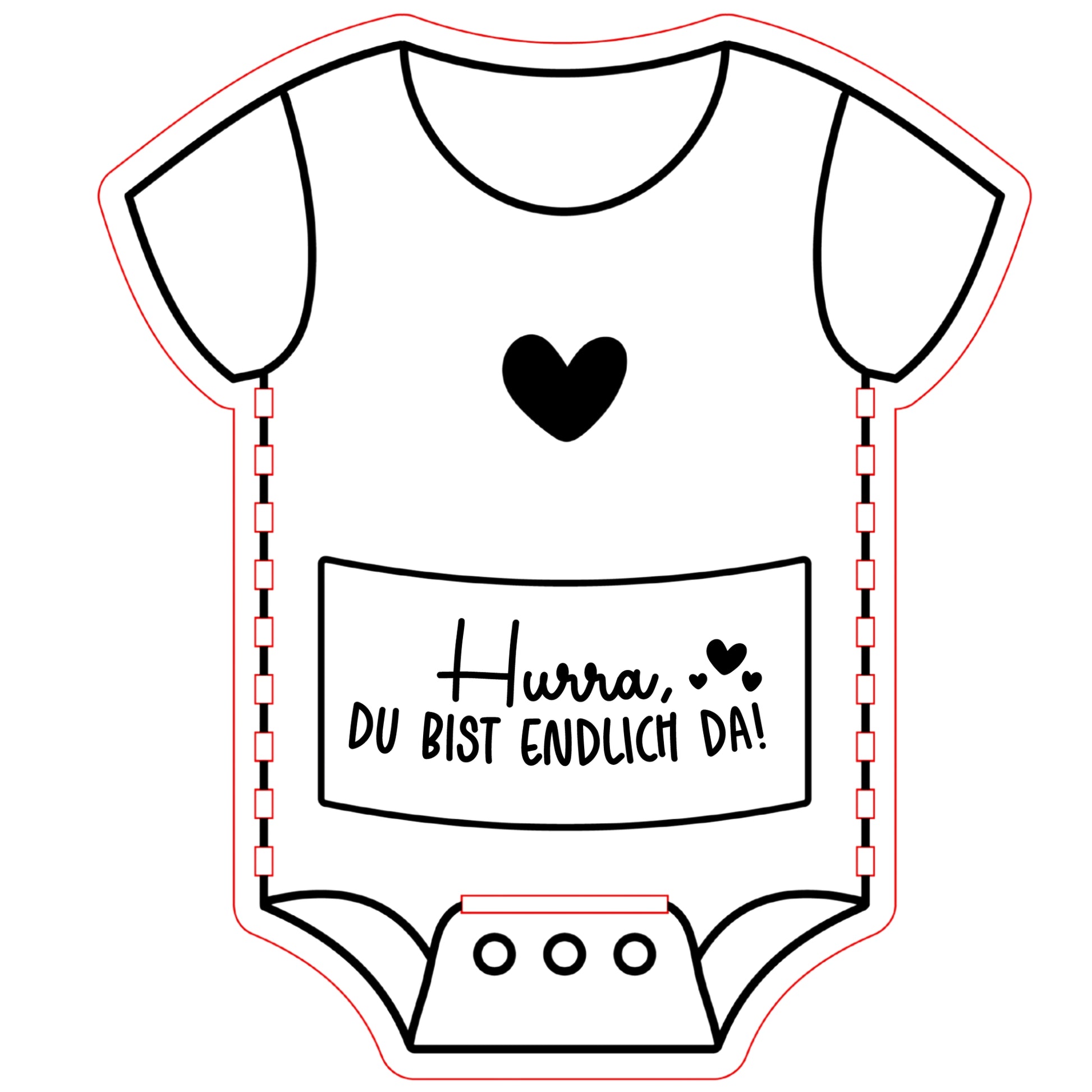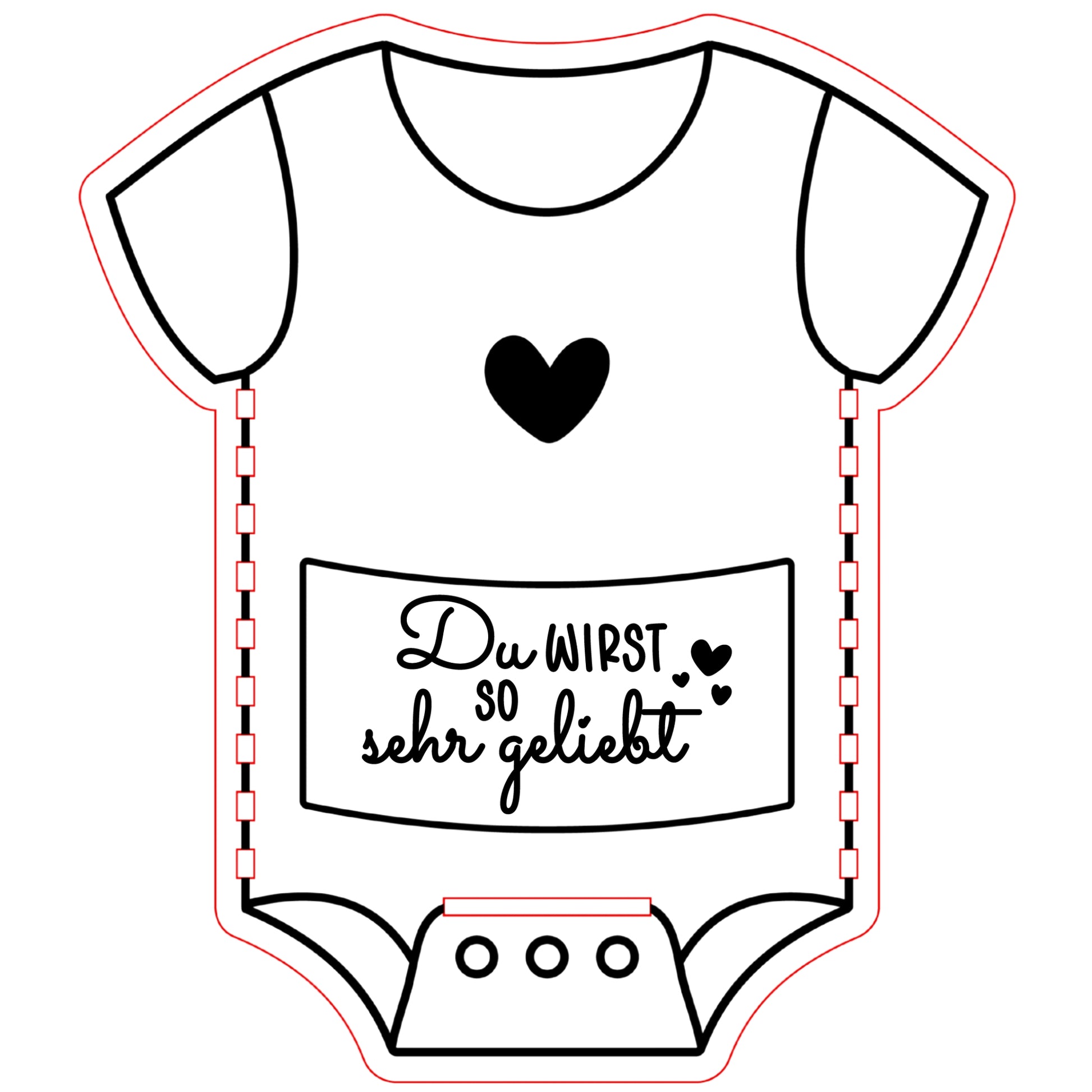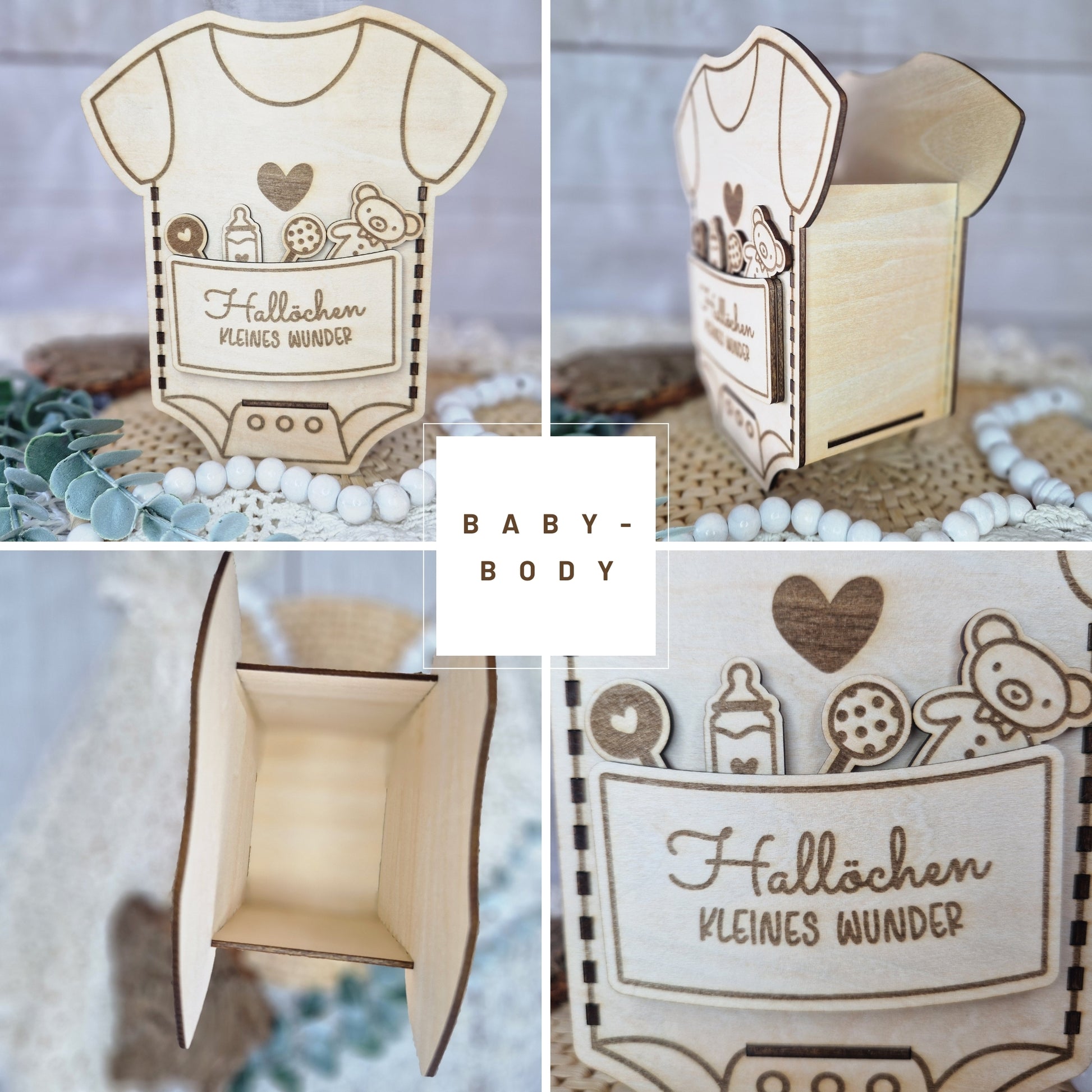 Dieser handgefertigte Baby-Body aus Holz ist ein bezauberndes Geschenk zur Geburt oder Babyparty. Aus 3 mm naturbelassenem Holz gelasert, detailreich graviert (z. B. Schnuller, Rassel, Herz) und mit vorgefertigten Sprüchen zur Auswahl – ganz ohne Personalisierung. Der Innenraum bietet Platz für Geldgeschenke, Gutscheine oder kleine Erinnerungen.