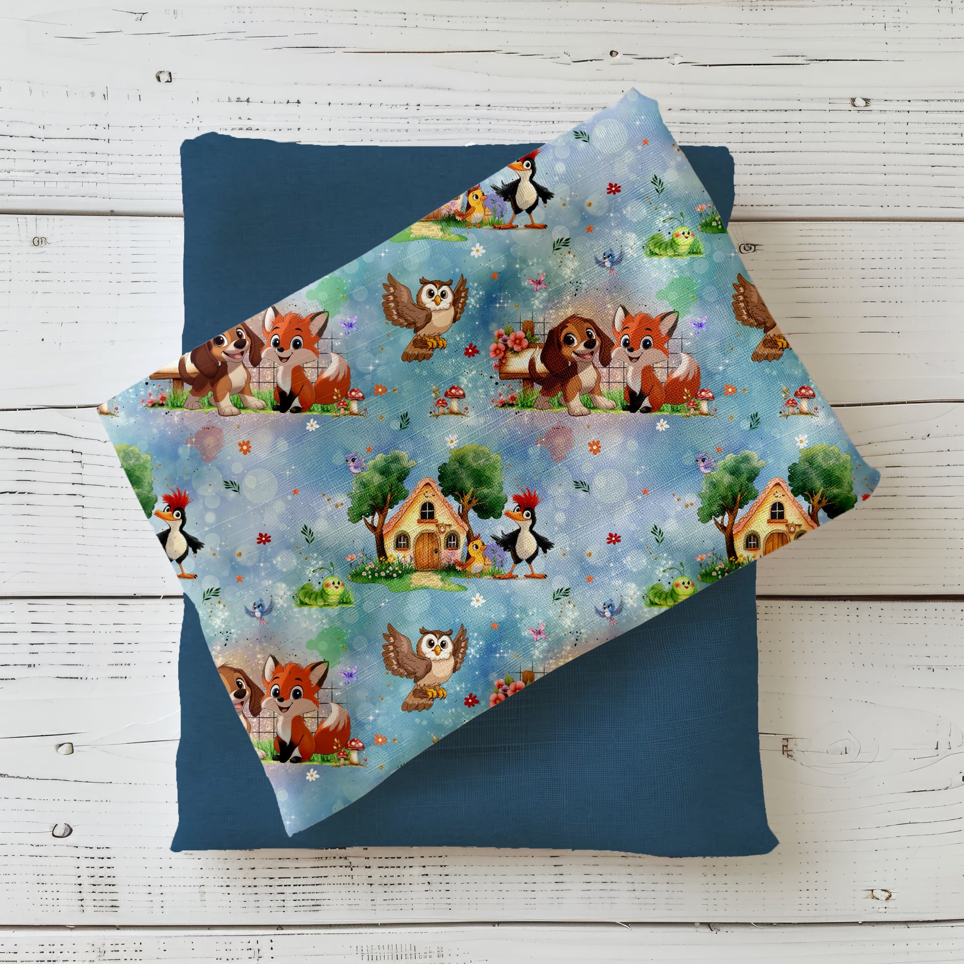 Mit dem zauberhaften Design „Pfotenfreunde“ ziehen niedliche Waldbewohner ins Kinderzimmer ein! 🏡✨ Liebevoll gestaltete Illustrationen von Fuchs 🦊, Hund 🐶, Eule 🦉, Specht 🔴 und einem märchenhaften Häuschen machen diesen Jersey-Stoff zum echten Hingucker. Der sanft strukturierte blaue Hintergrund 🌌 mit feinen Details wie Blumen 🌸 und Punkten sorgt für eine verträumte Atmosphäre.