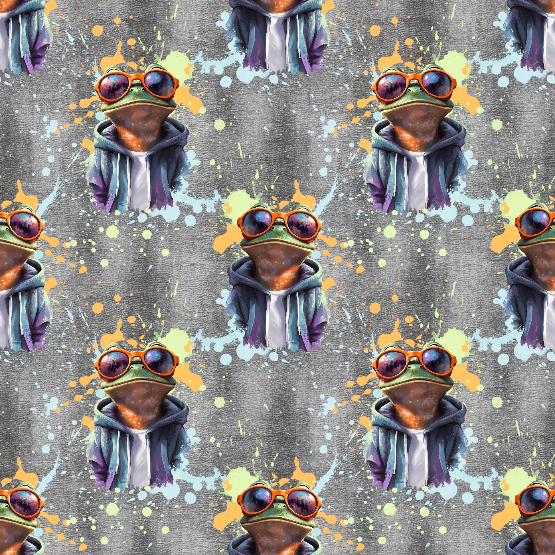 Mit dem Design „Crazy Frog“ bringst du richtig Farbe in deine Nähprojekte! Die coole Froschfigur mit Kapuzenpulli und stylischer Brille sorgt garantiert für Aufsehen. Bunte Farbspritzer auf dunkelgrauem Hintergrund machen den Stoff besonders lebendig und originell – perfekt für kleine Trendsetter und alle, die es etwas verrückter mögen!