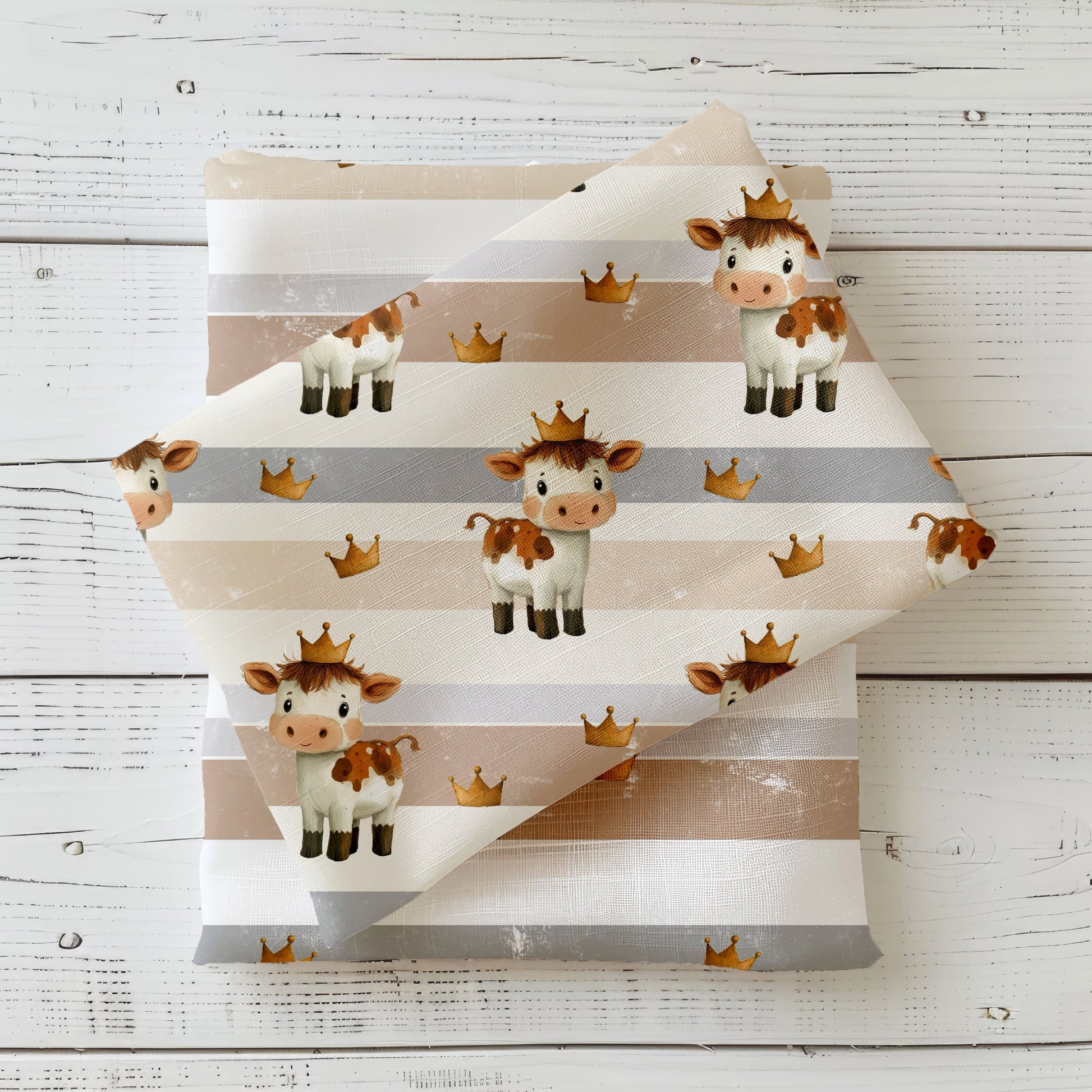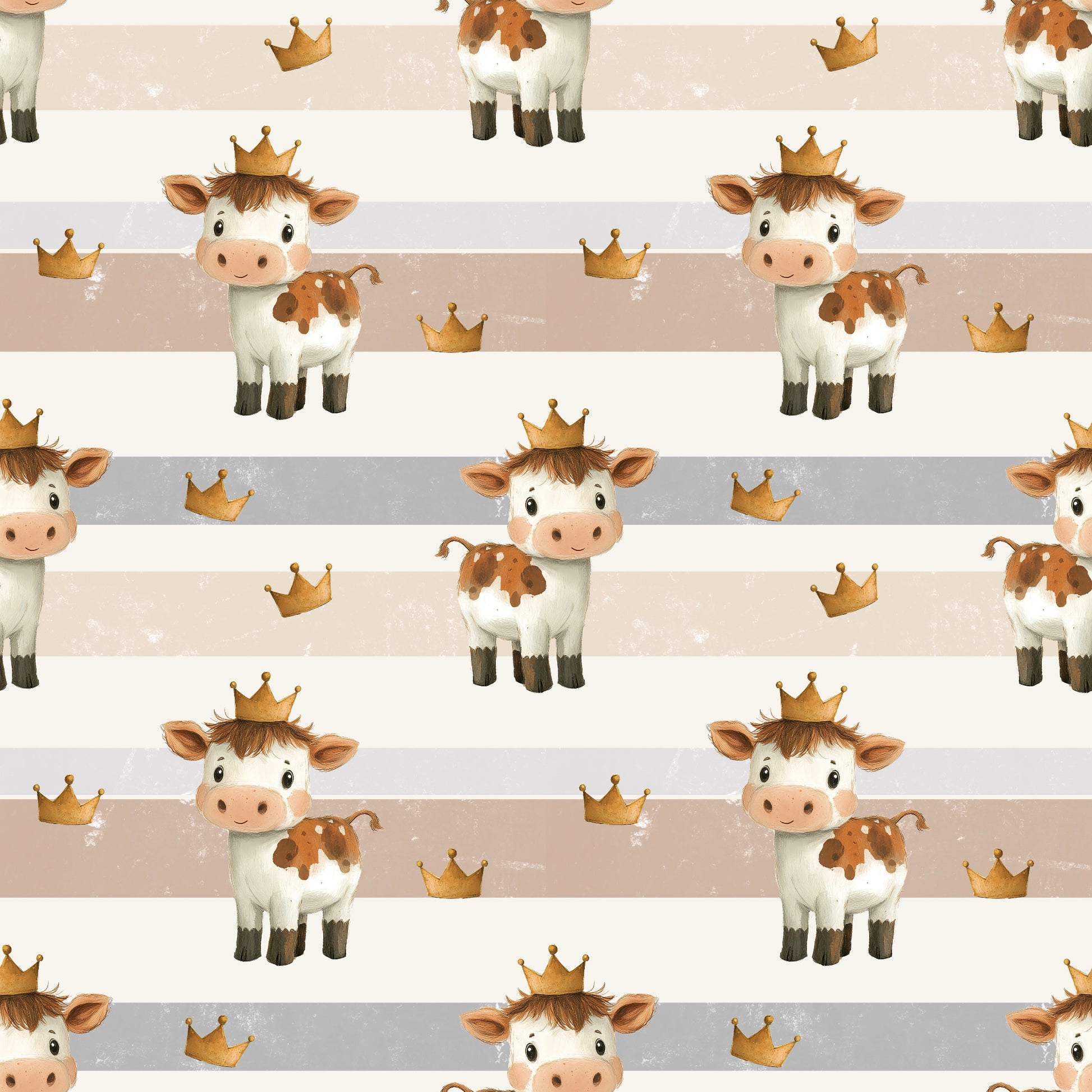 Das Design „Kuh König“ lässt Herzen höher schlagen! Die niedlichen, gekrönten Kälbchen auf sanft gestreiftem Hintergrund in Naturtönen sind ideal für liebevolle Kinderkleidung. Ob für kleine Prinzen oder Prinzessinnen – dieser Stoff macht jedes Outfit königlich süß. 🤎👶