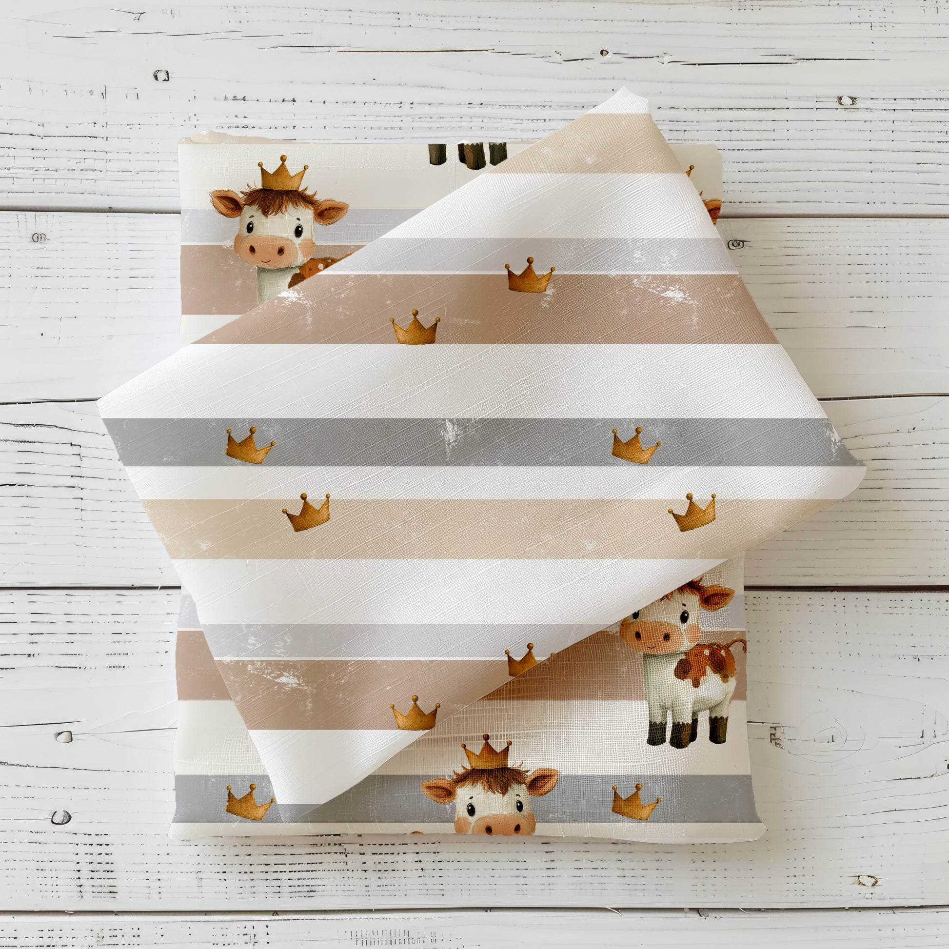 Der Kombistoff „Kuh König“ ist die ideale Ergänzung zum Hauptdesign. Statt der kleinen Kuh trägt dieser Kombistoff ausschließlich zarte Streifen in Naturtönen – verziert mit niedlichen kleinen goldenen Kronen. Dezent, verspielt und perfekt für detailverliebte Nähprojekte! 🧵💫